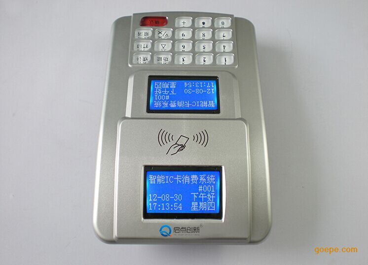 IC卡食堂收费系统,IC卡消费机,食堂刷卡机IC卡台式网络TCP-IP收费机,产品外观精致高雅、操作简便、数据安全可靠、功能实用,并可广泛应用于大型娱乐场所、餐厅、超市、公共餐厅等各种各类收费场所和计费应用项目。智能卡终端支付设备可以大幅度的提高支付管理效率,用户消费时只需在感应区的有效距离内出示卡,消费机认可后便可完成消费,既方便用户消费,又方便管理人员统计和管理消费情况,实现了消费数据采集、数据统计和信息查询过程自动化.新一代智能卡机可应用在校园一卡通、社区、企业、超市、医院、城市一卡通等多个消费领域。一、技术参数:1. 双面128*64四行中文液晶图形显示。